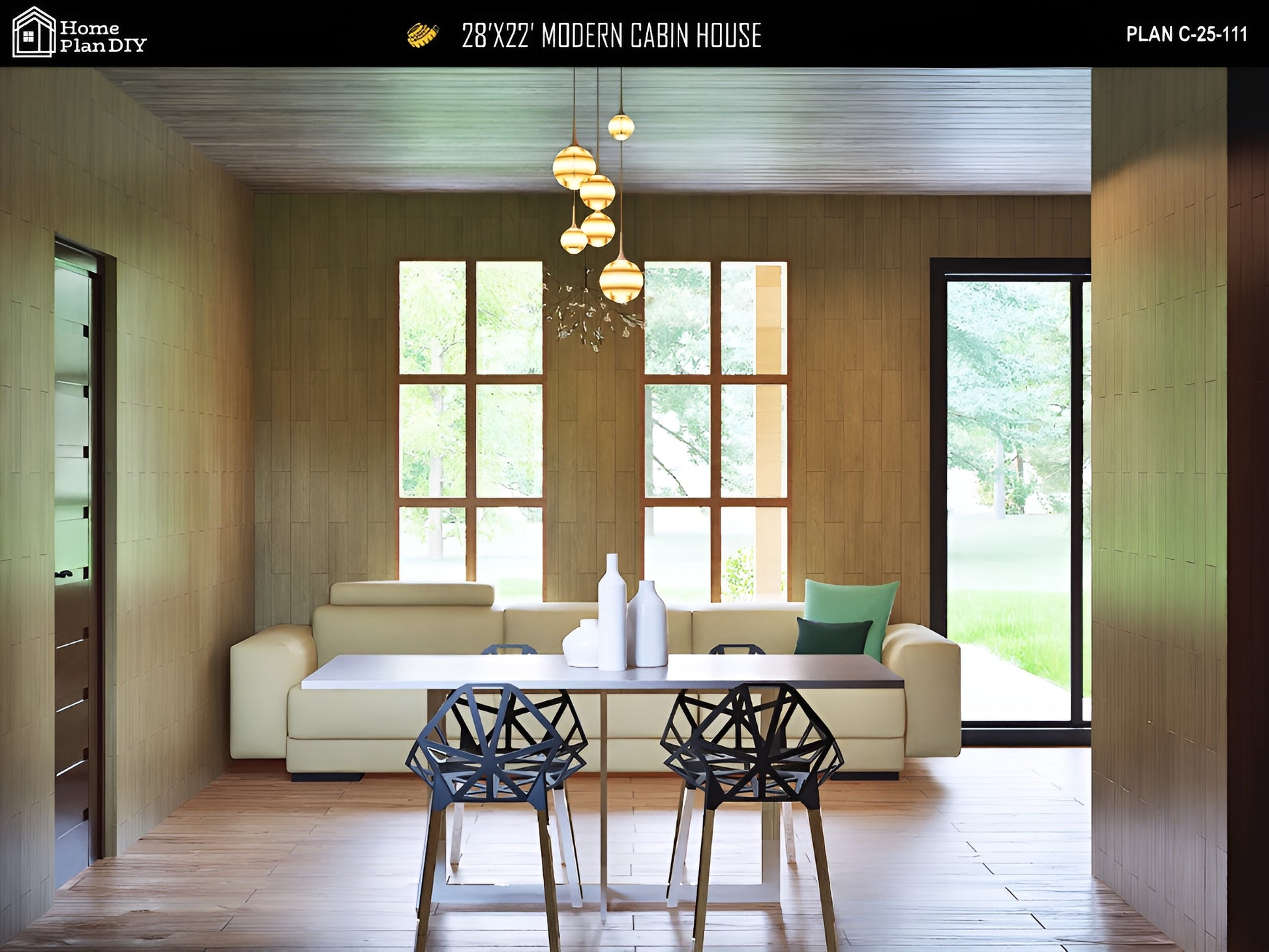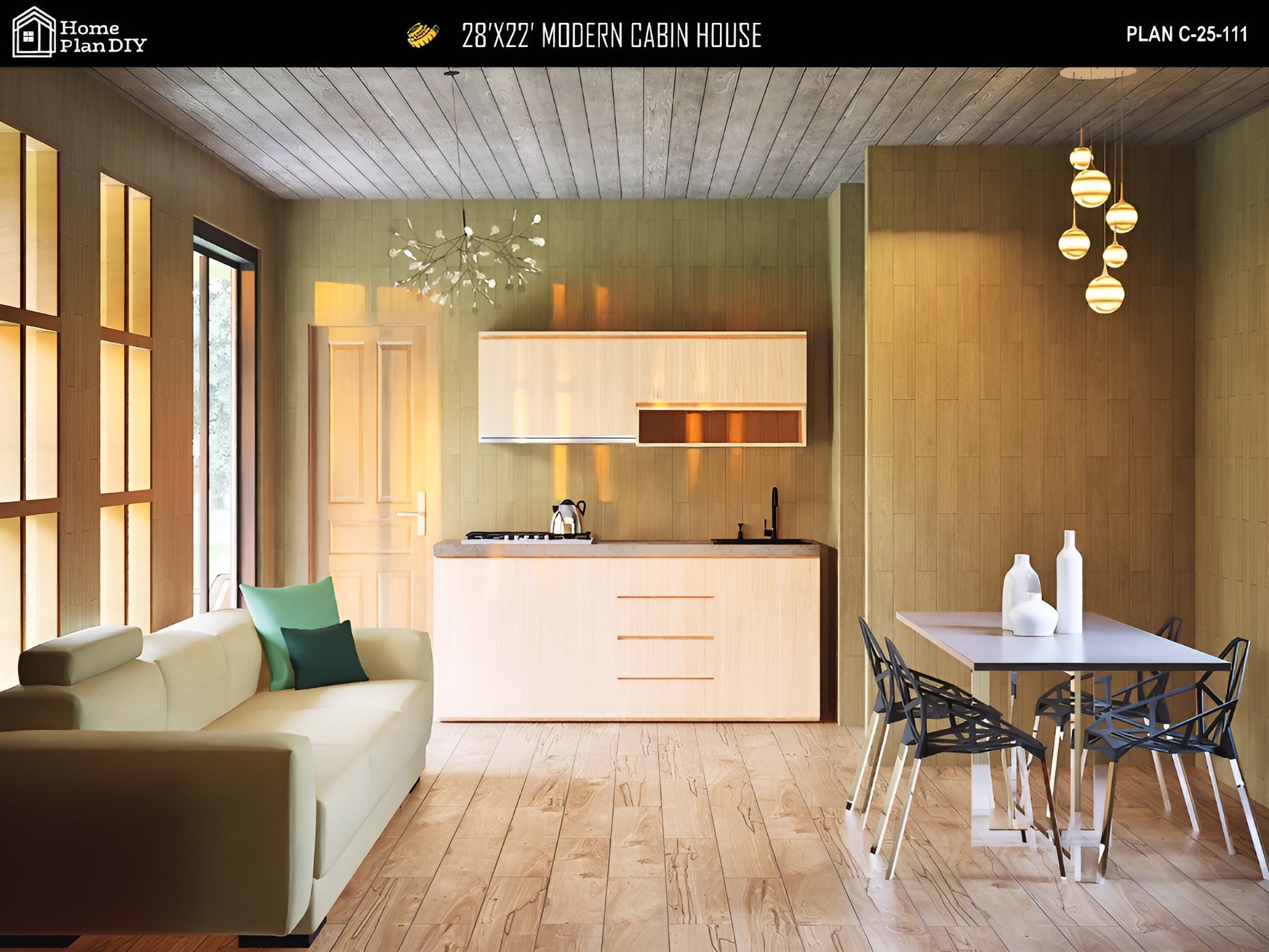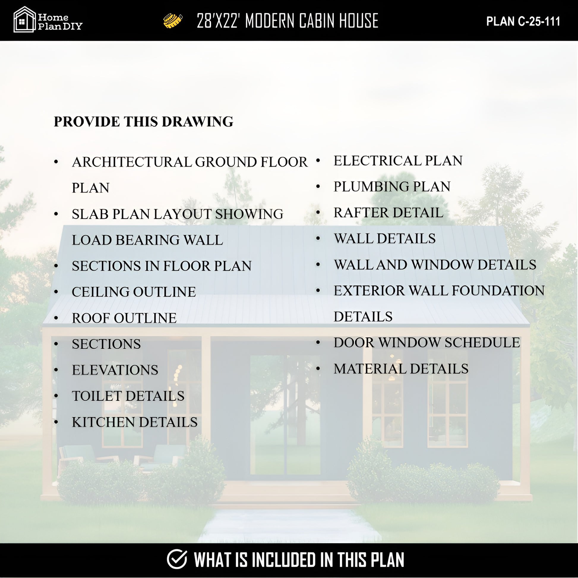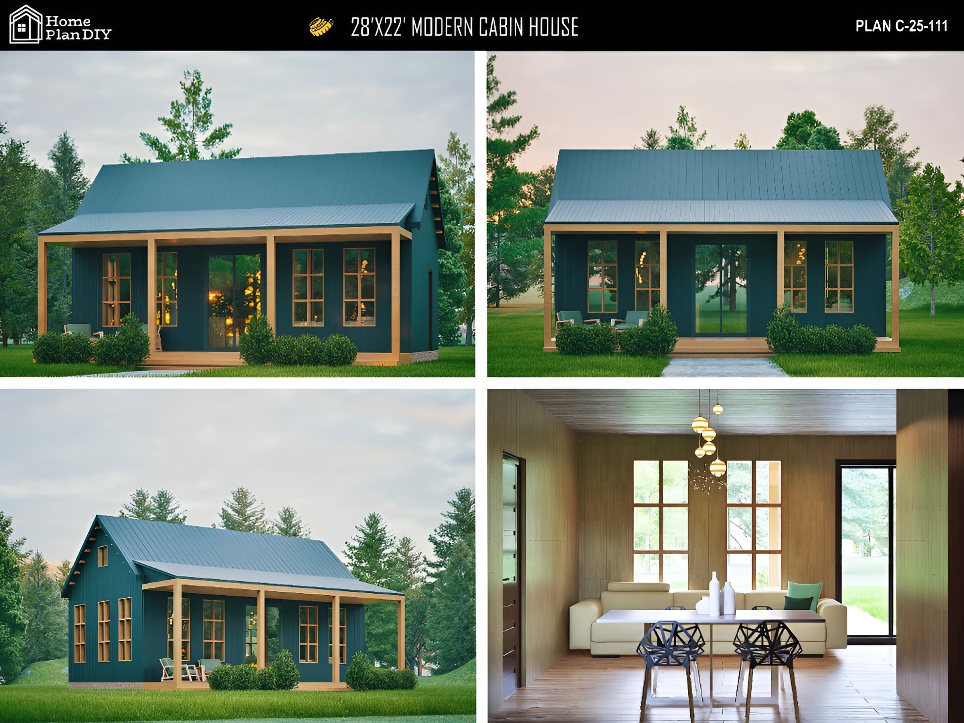 Discover the charm of compact modern living with this 28' x 22' Modern Cabin Plan with Loft , a beautifully detailed 1 bedroom, 1 bath cottage design perfect for DIY builders, homeowners, or Airbnb investors. This cozy 602 sq. ft. home blends simplicity, warmth, and functionality, ideal for weekend getaways, guest houses, or small living projects.