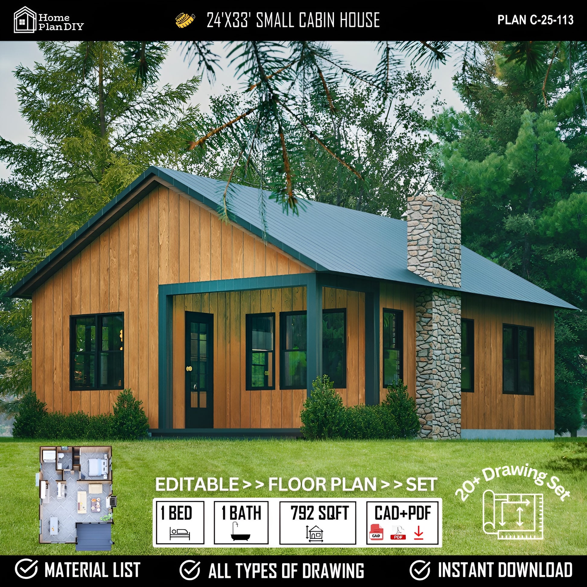 This cozy modern small cabin plan combines timeless style with everyday comfort in a compact 24′×33′ footprint. Featuring clean gable roof lines, wide wood-trimmed windows, and a welcoming front porch, this design strikes the ideal balance of modern simplicity and rustic warmth. Inside, you’ll find an open-concept living area with a full kitchen, one spacious bedroom, and one bathroom, all arranged efficiently within 792 sq. ft. Designed for practical living or peaceful getaways, it’s perfect as a guest house, lake cabin, Airbnb rental, or backyard ADU. With the included printable PDF plan set and editable CAD files, you can easily modify and adapt the design to your preferences and site needs.