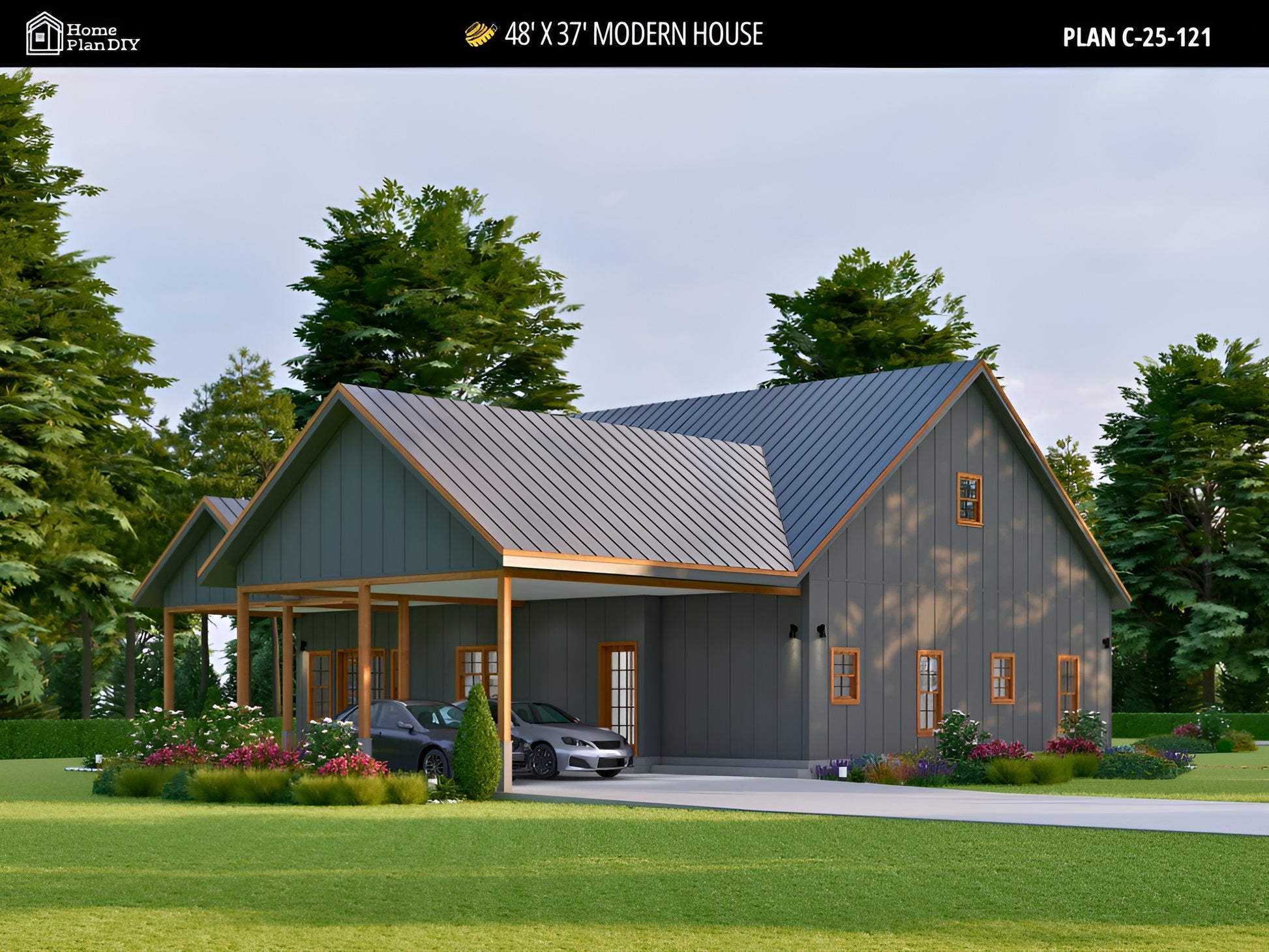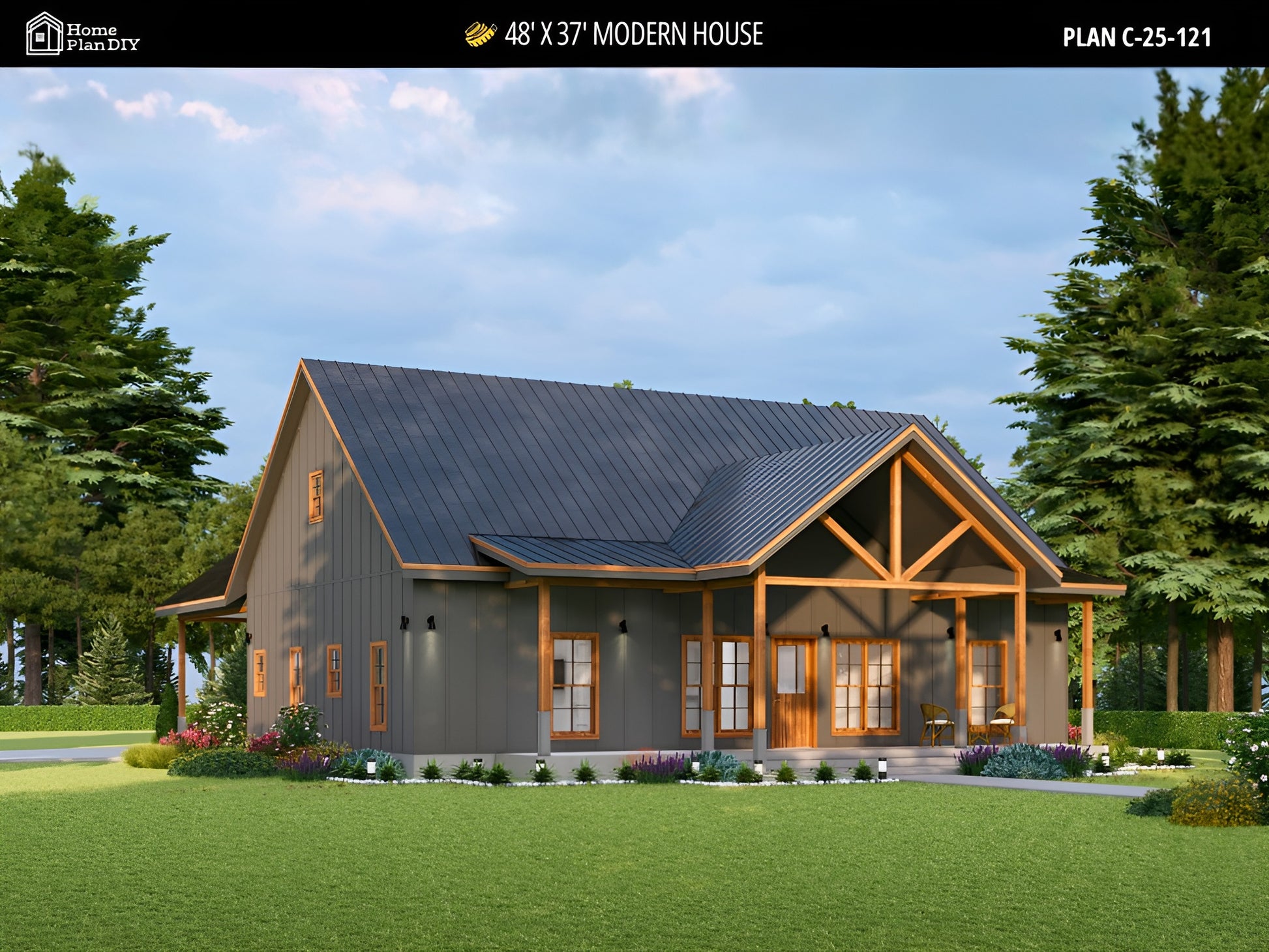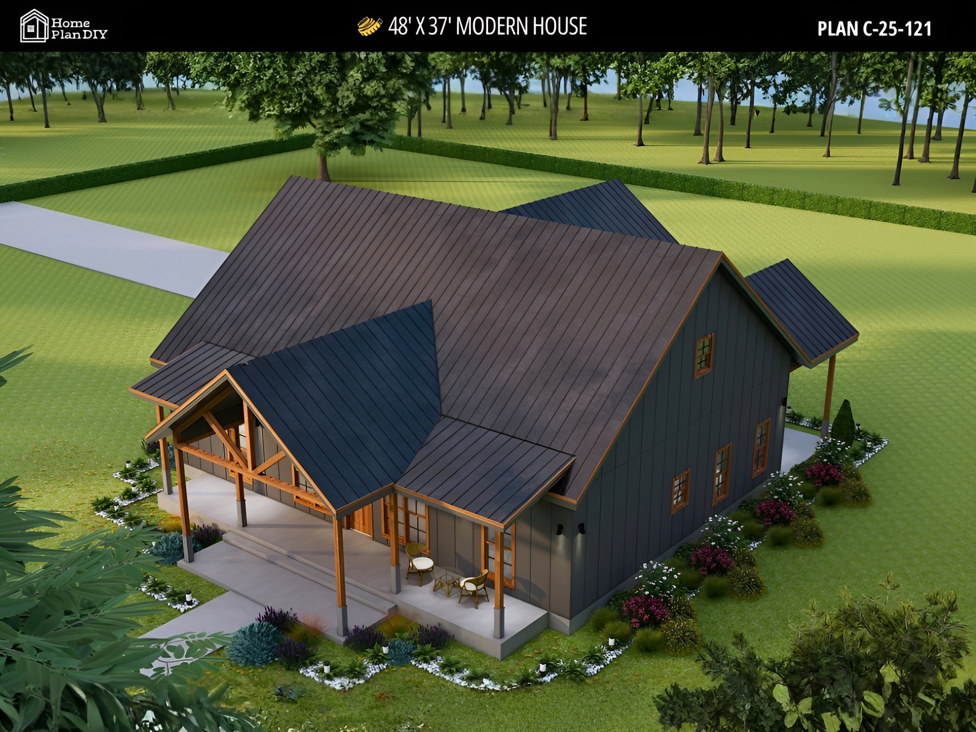 This 48' x 37' Modern Farmhouse Cottage House Plan is a practical and comfortable one-story home designed with everyday living in mind. The layout includes 3 bedrooms, 2 full bathrooms, and an attached garage, making it a great option for families, retirees, or anyone looking for a well-balanced farmhouse-style home.