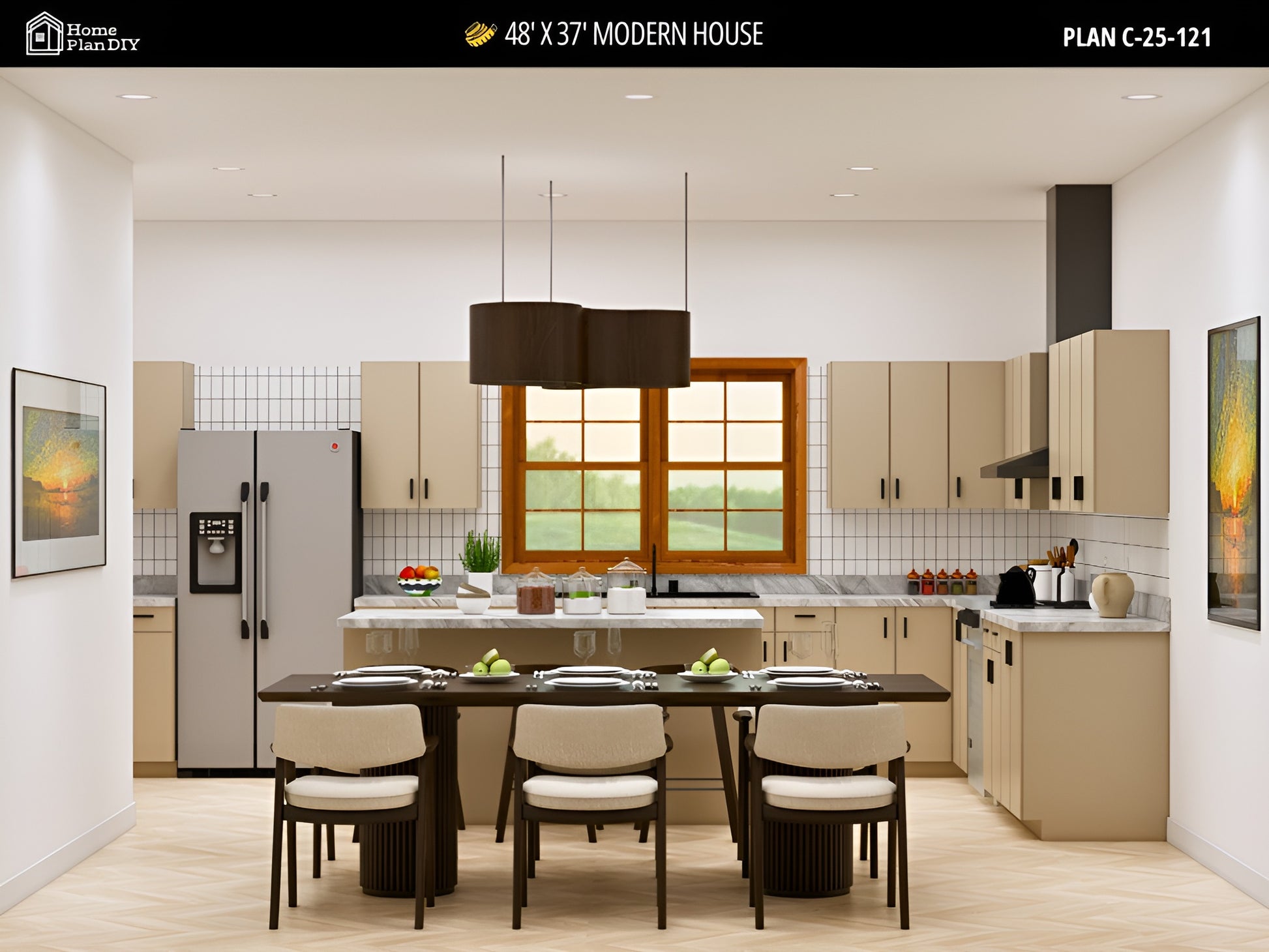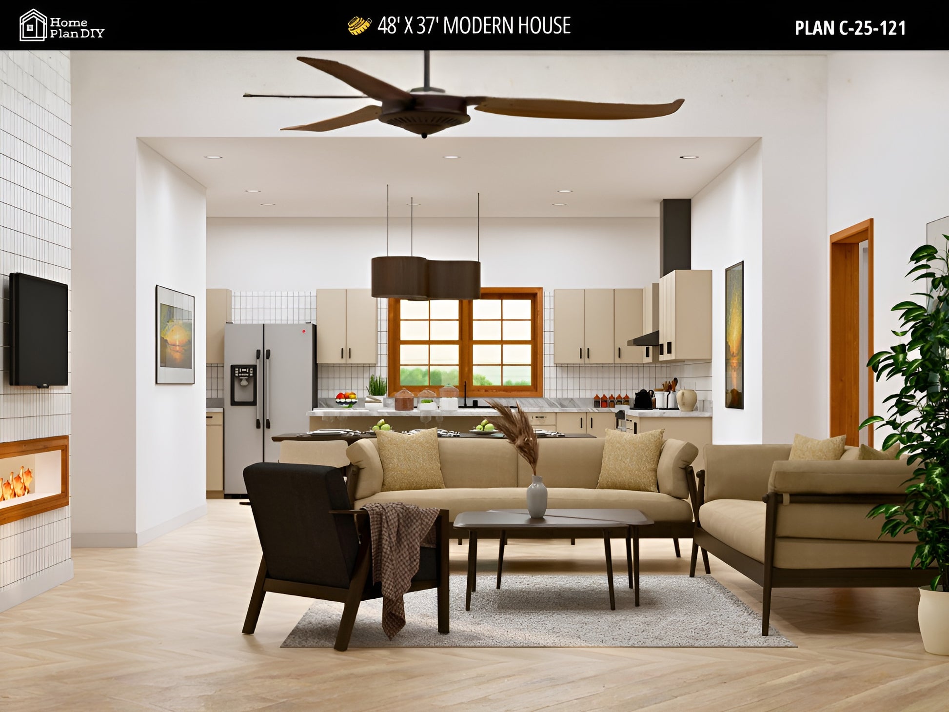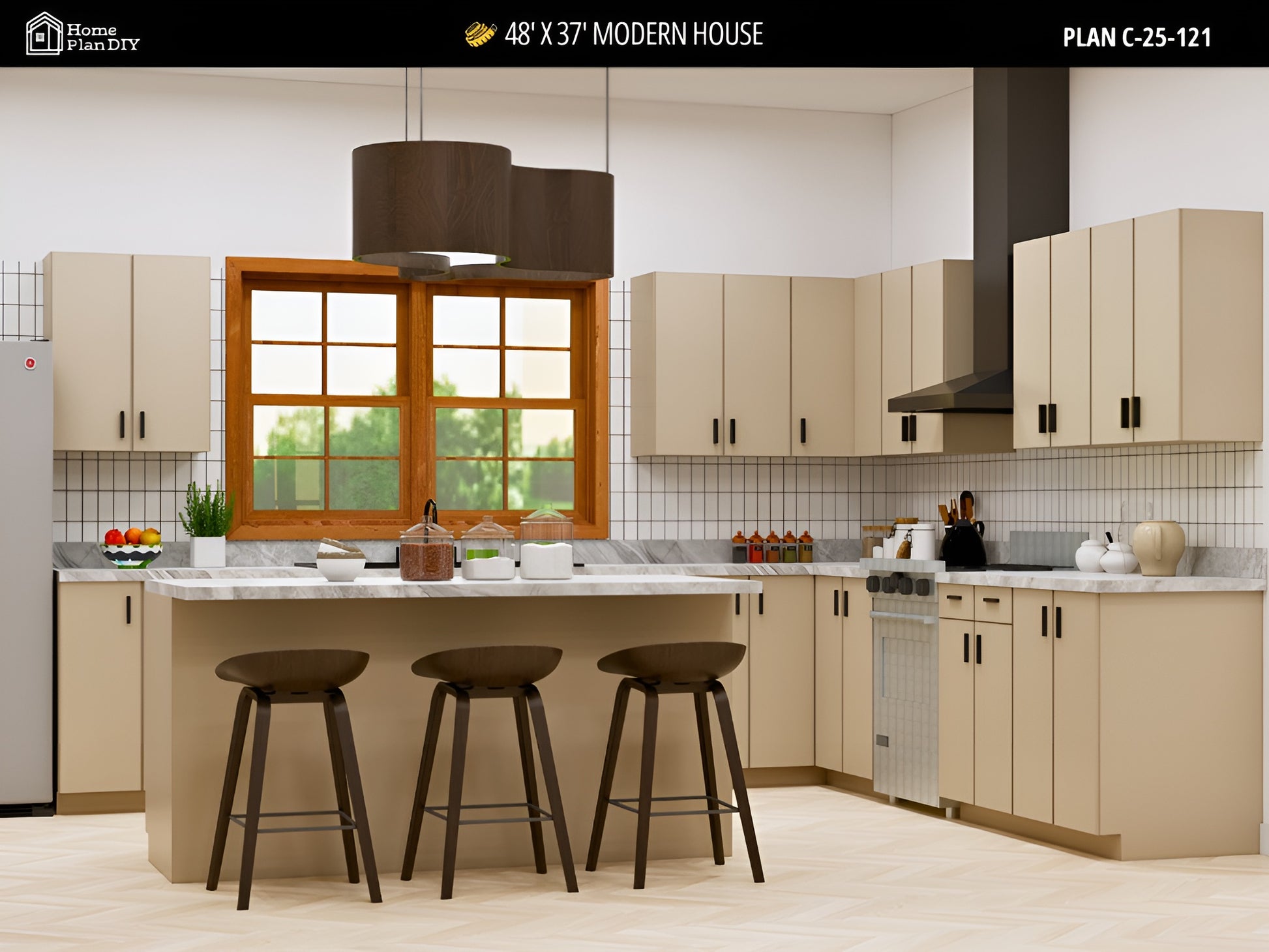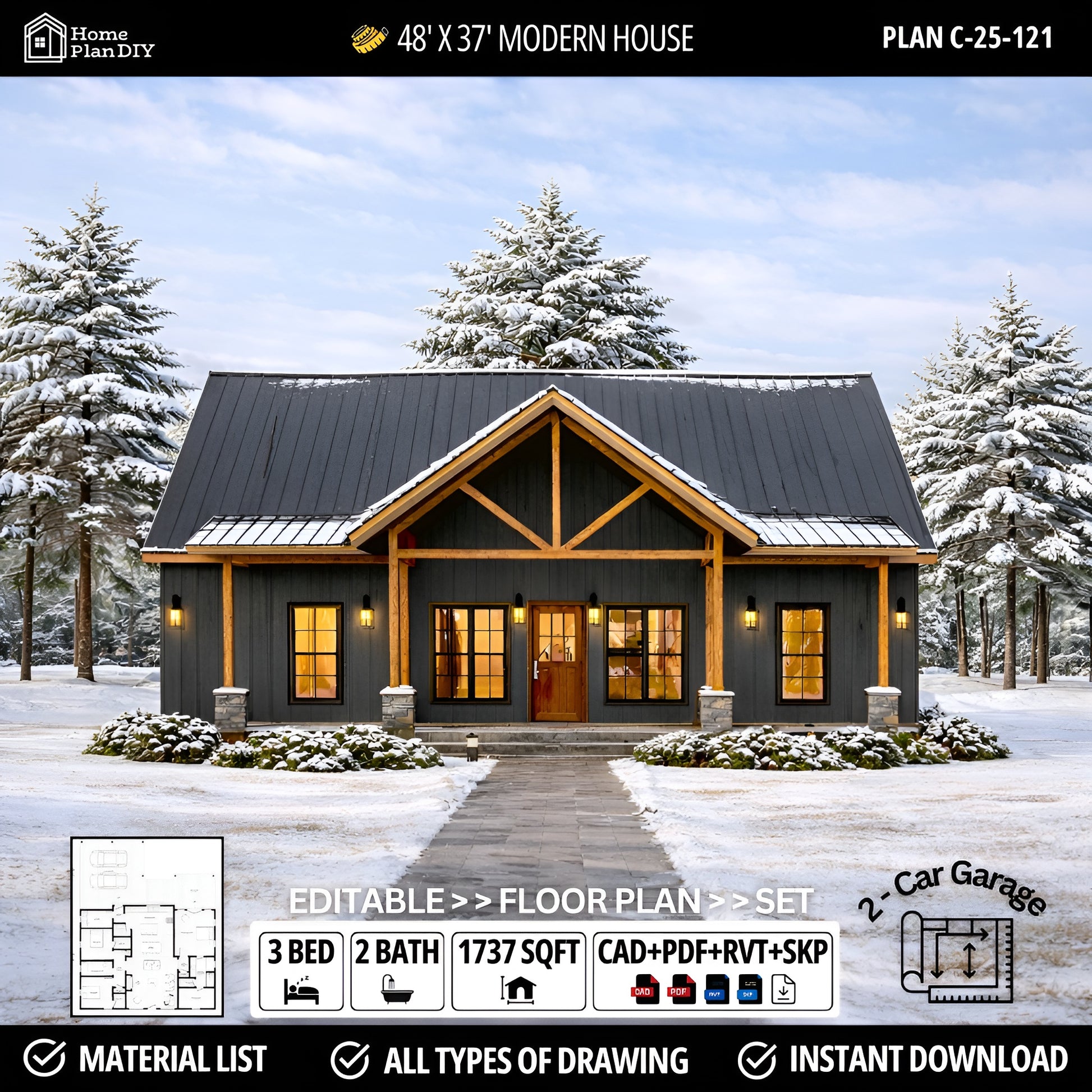 This 48' x 37' Modern Farmhouse Cottage House Plan is a practical and comfortable one-story home designed with everyday living in mind. The layout includes 3 bedrooms, 2 full bathrooms, and an attached garage, making it a great option for families, retirees, or anyone looking for a well-balanced farmhouse-style home.
