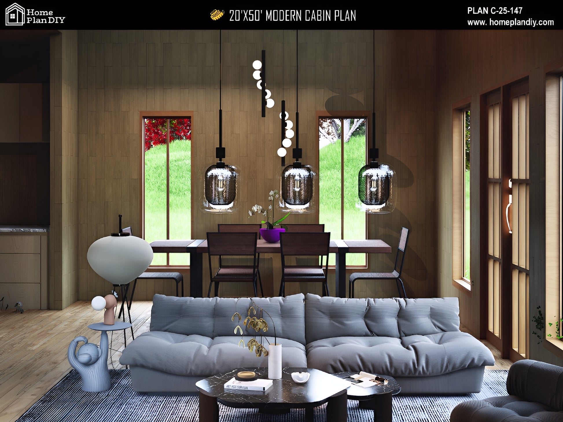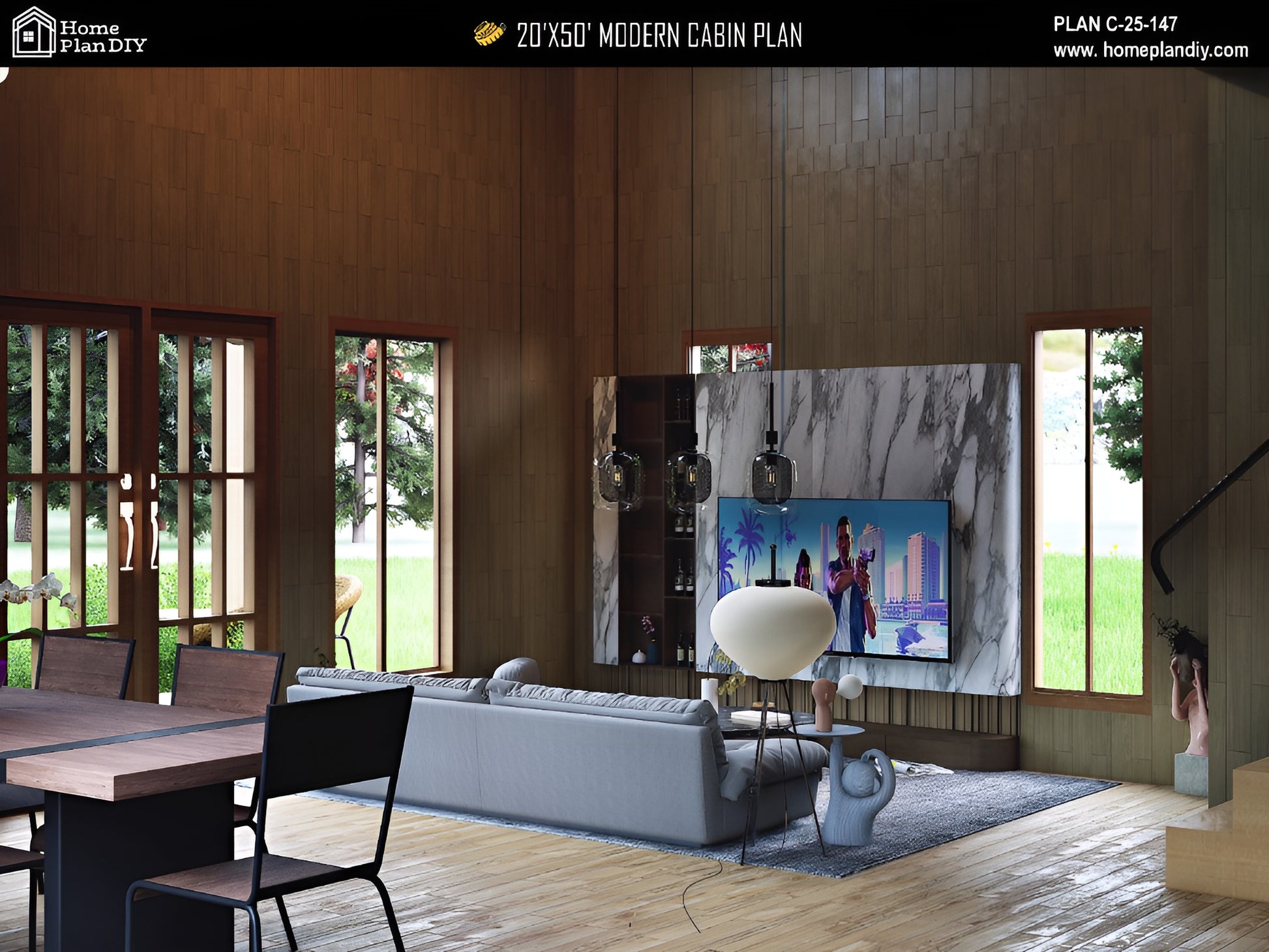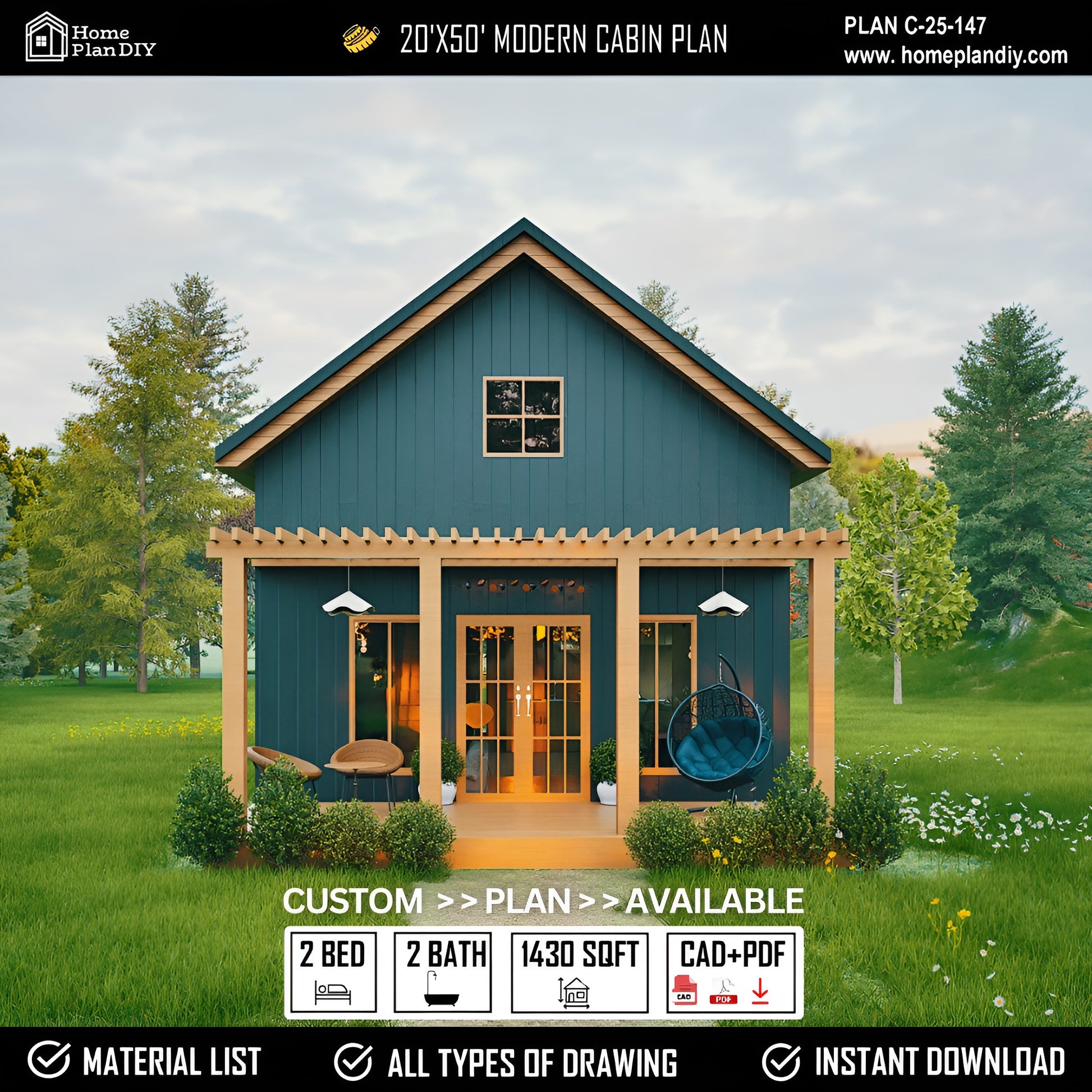 Build Your Dream Cabin Today! Discover our 20' x 50' Modern Small Cabin House Plan with Loft—crafted for cozy living with a spacious, efficient layout. Whether you’re building a family retreat, Airbnb rental, or personal getaway, this 2-bedroom, 2-bath design blends style, comfort, and practicality.