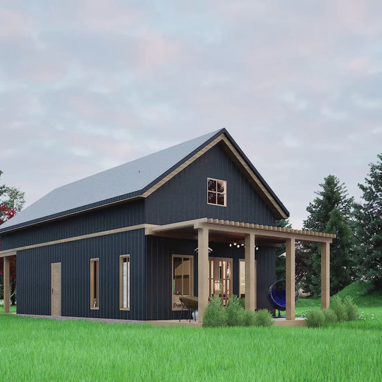 This 1,430 sq. ft. modern cabin plan includes a bright open living space, a full kitchen, two bathrooms, and a private loft suite. The smart design makes it perfect for DIY builders or anyone looking for an affordable yet stylish home.