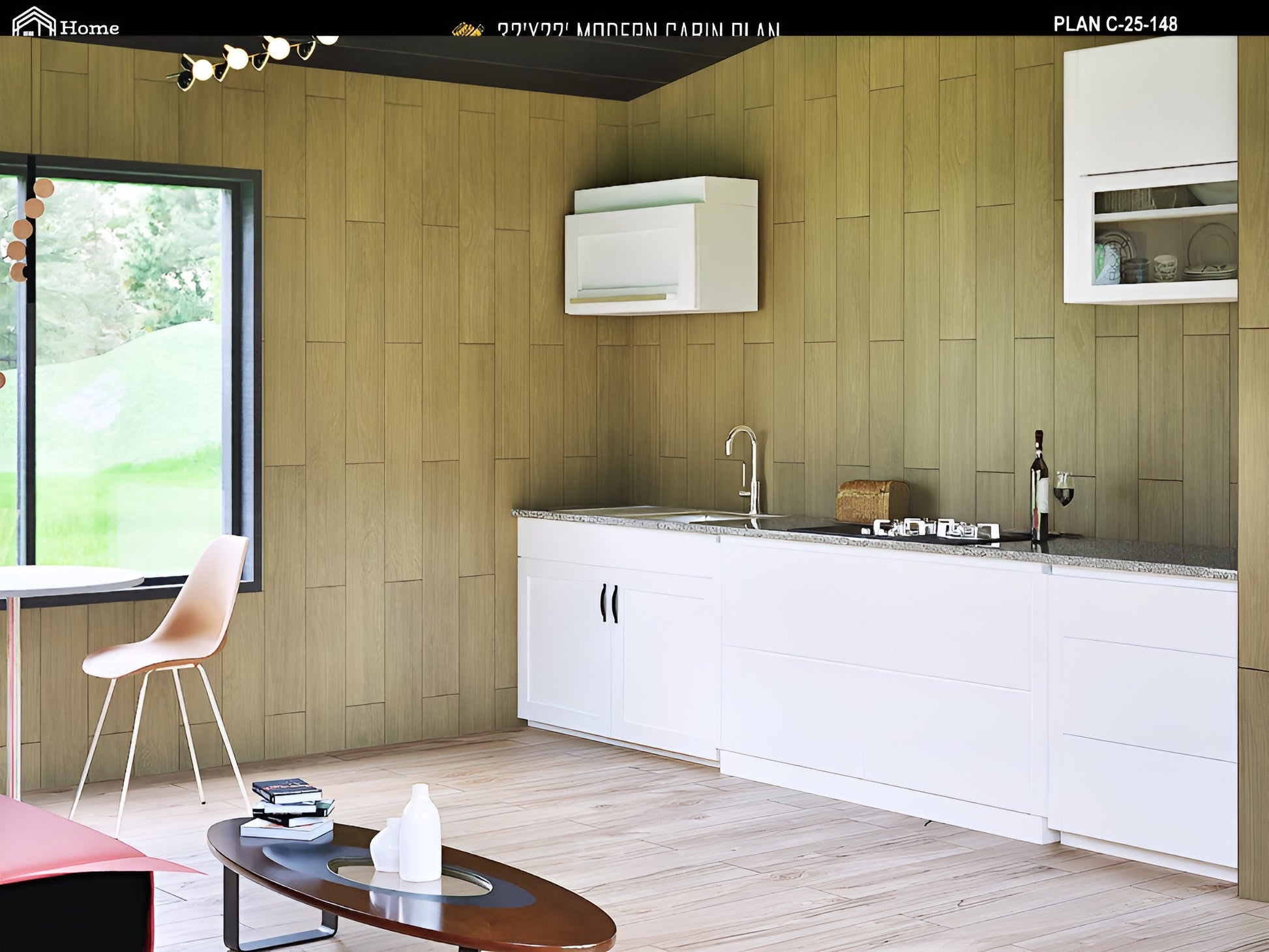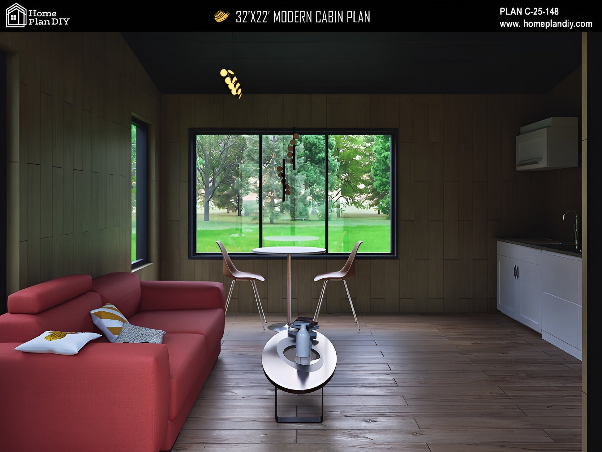 Experience cozy, efficient living with this 32’ x 22’ Modern Tiny Cabin Plan, thoughtfully designed for comfort, simplicity, and DIY-friendly construction. Featuring a bright open-concept living area, full kitchen, private bedroom, and a relaxing front deck, this small home is perfect for weekend getaways, rental cottages, or full-time minimalist living.