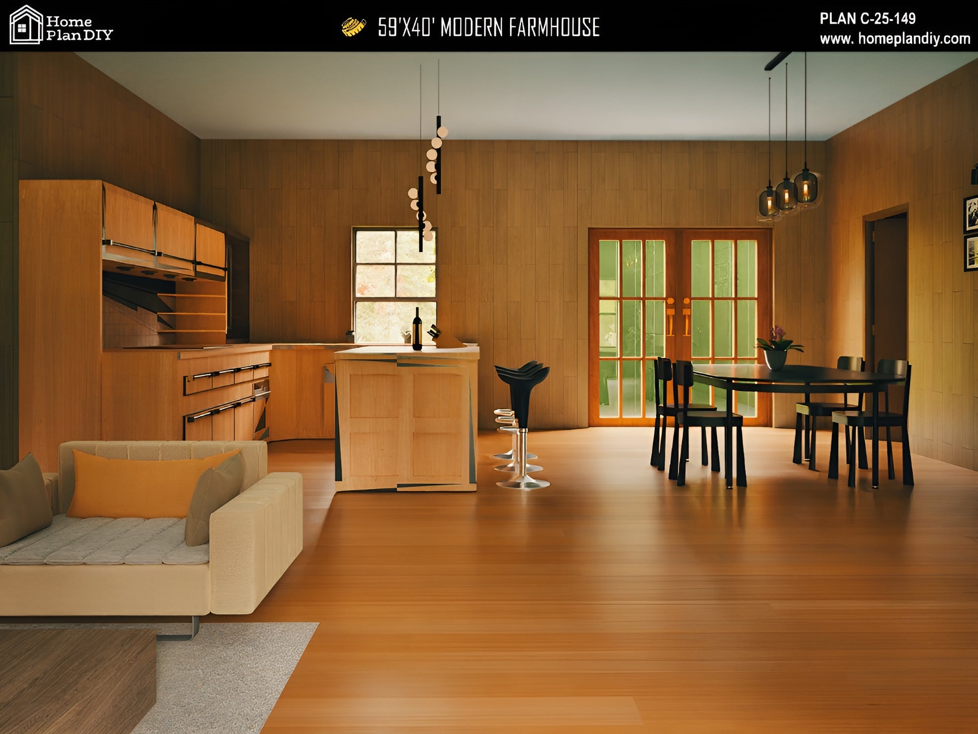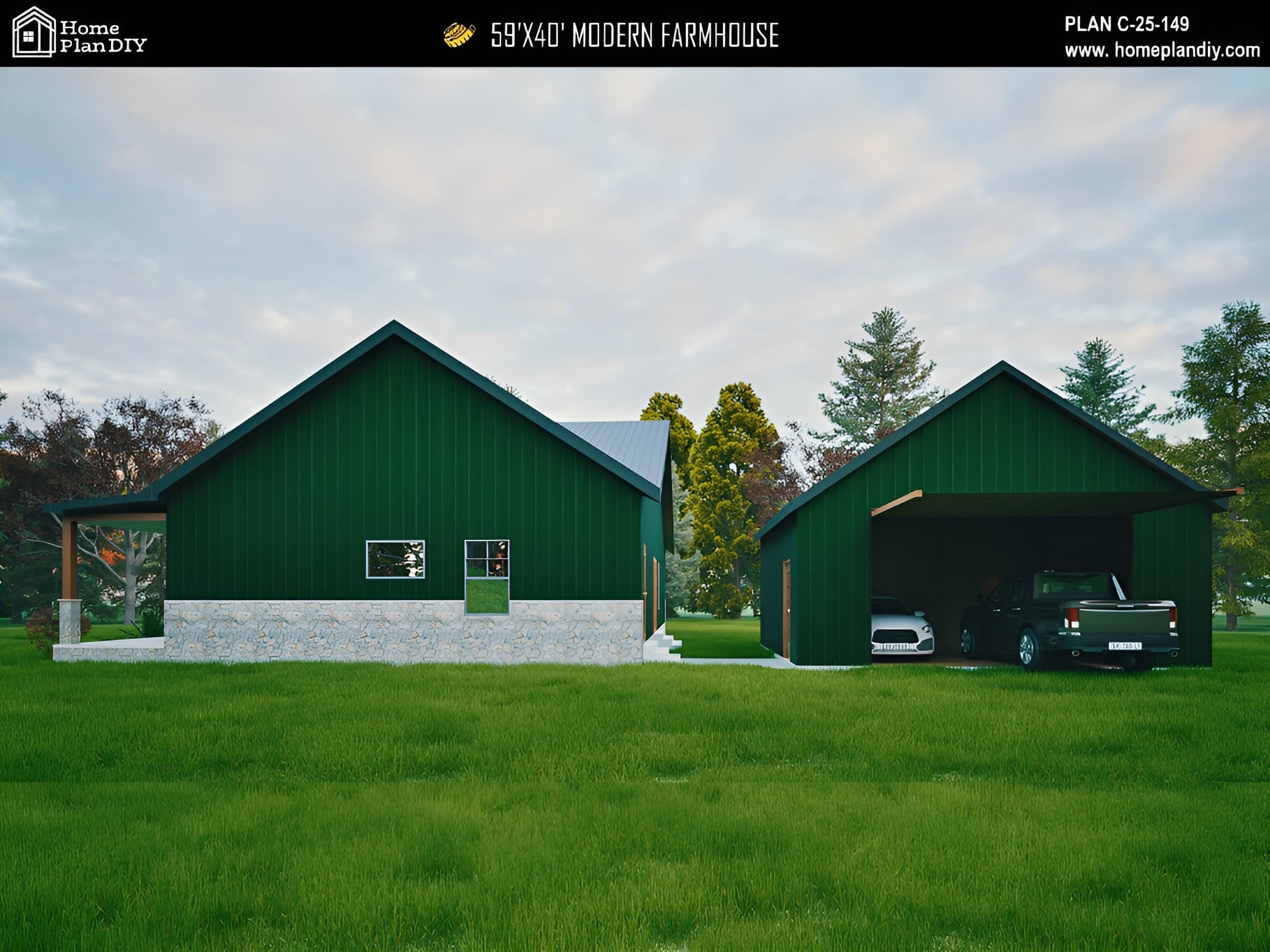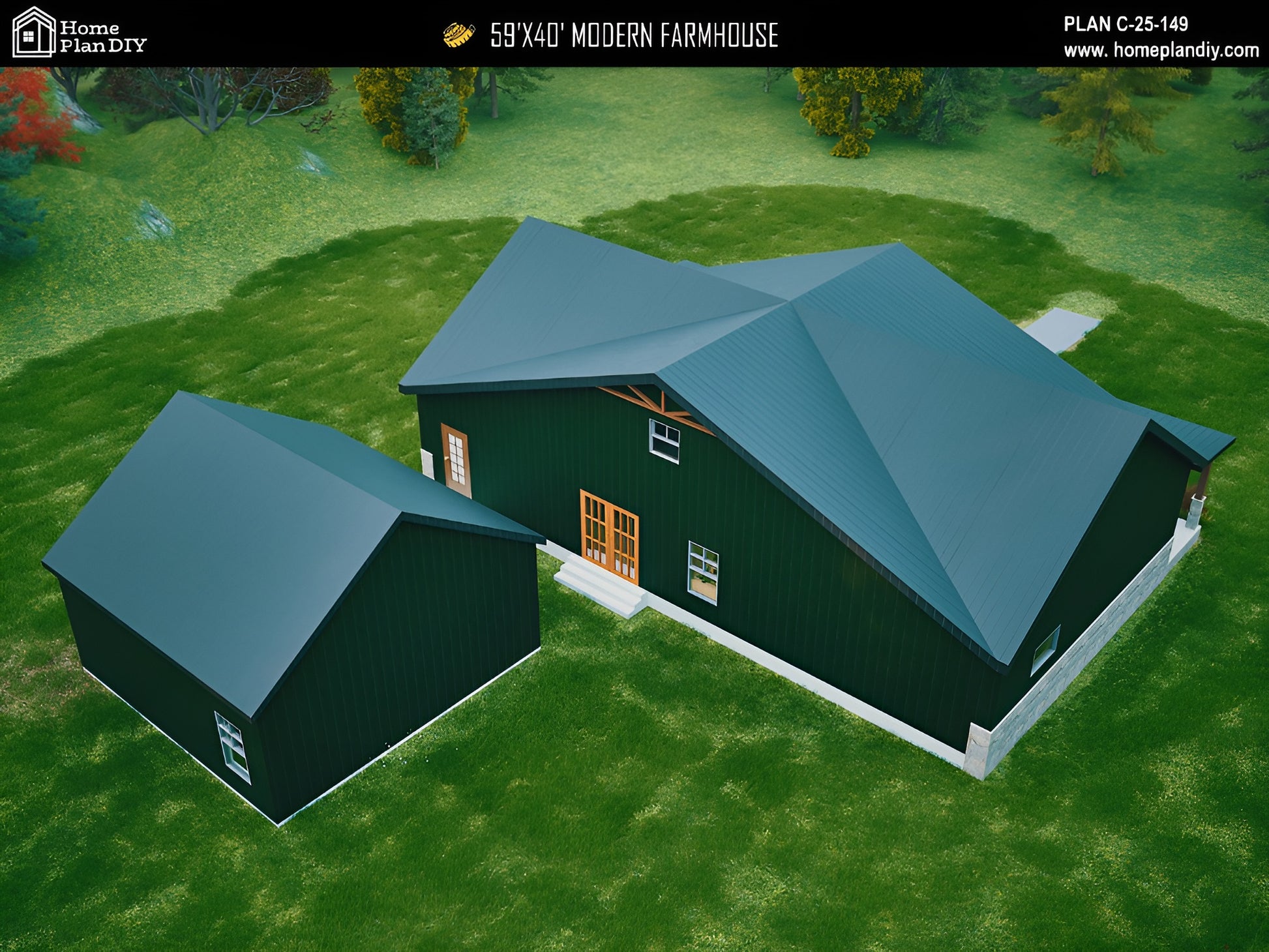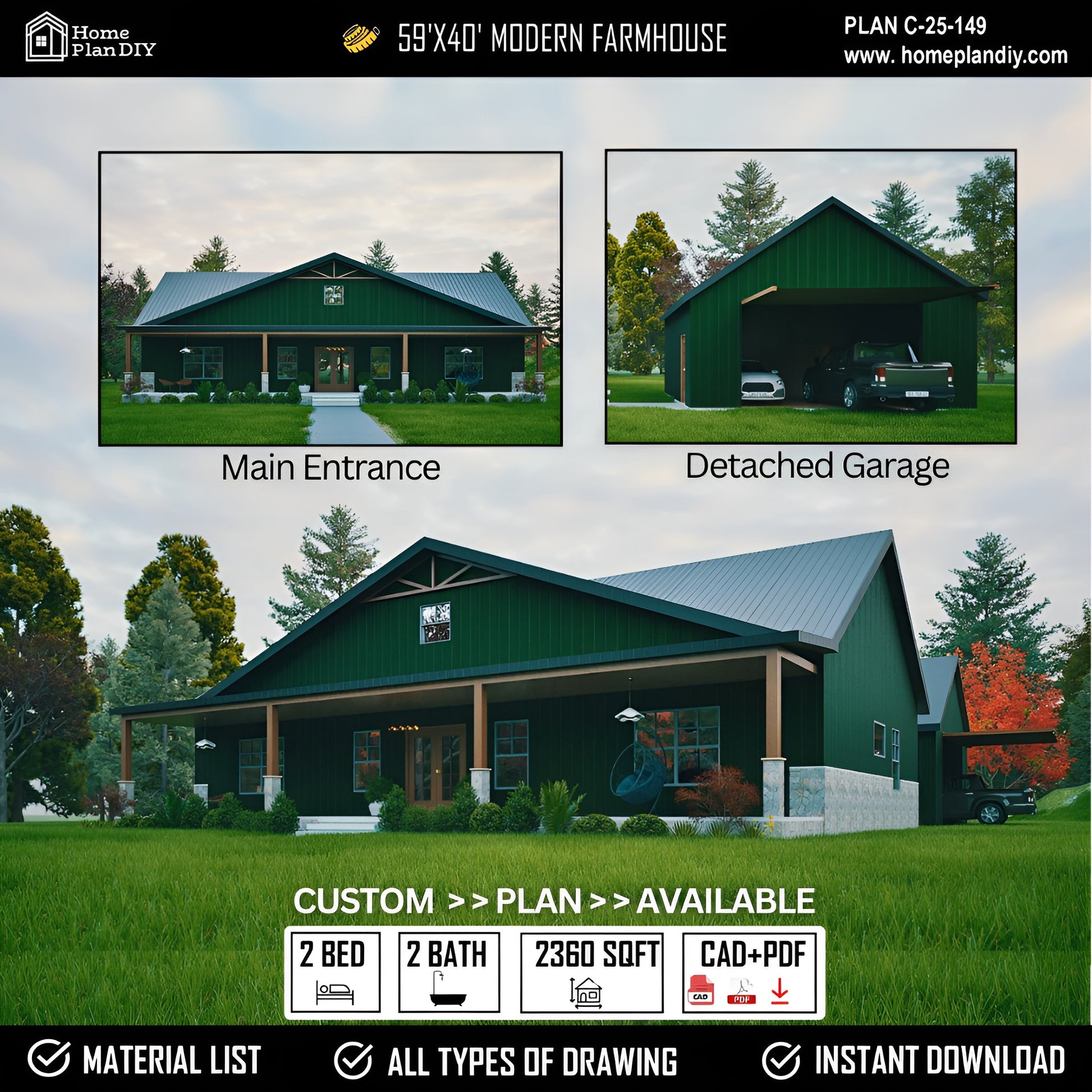 Bring classic country charm and modern design together with this 59’ × 40’ Modern Farmhouse Plan, featuring a detached 2-car garage, spacious open living, and cozy porch spaces. Designed for simplicity and comfort, this home is ideal for full-time living, guest homes, or Airbnb rentals.