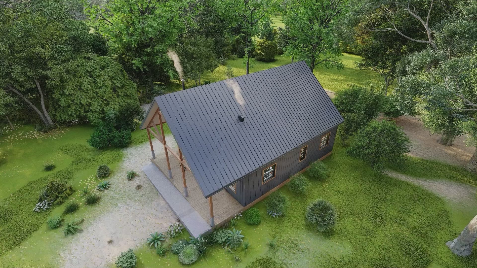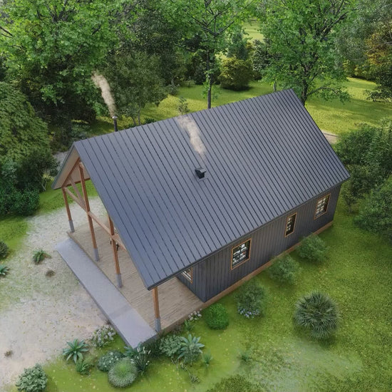 This clean, modern cabin plan offers vaulted ceilings, an open living / dining / kitchen area, and a loft bedroom overlooking the main space. It’s designed to be DIY-friendly, structurally sound, and highly adaptable for various climates and terrain.
