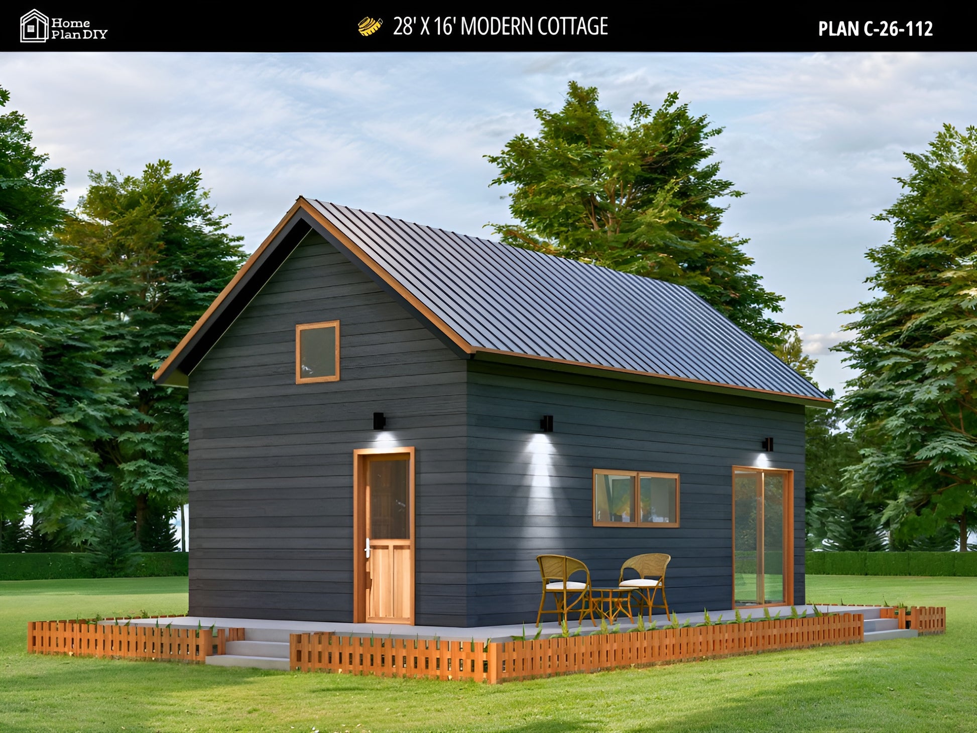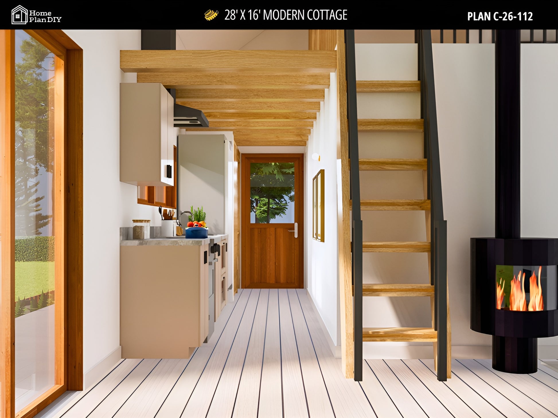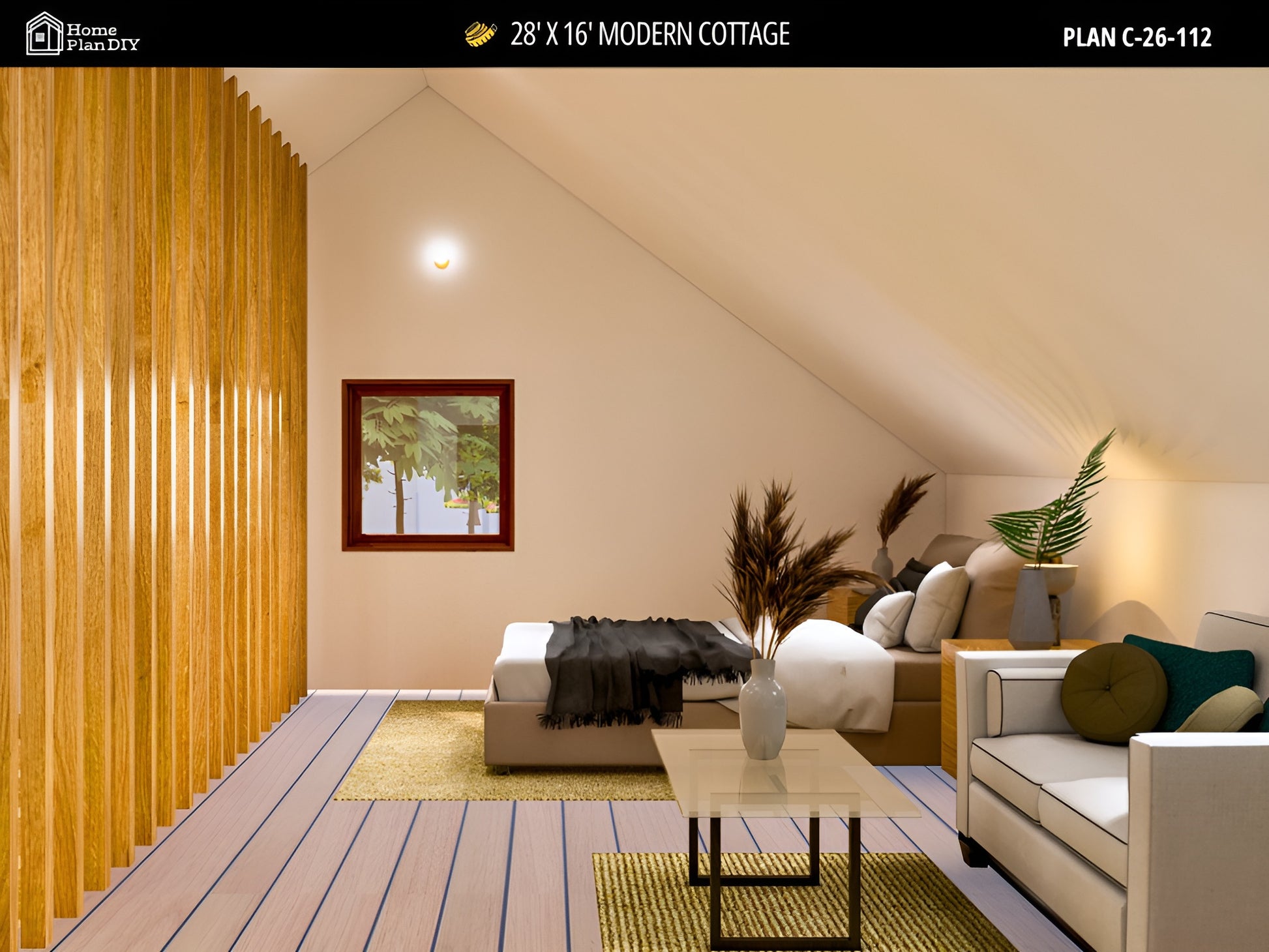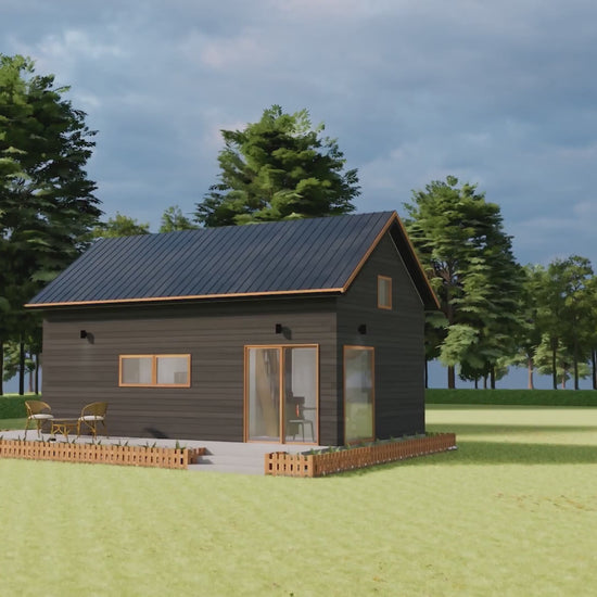 This 28' x 16' Tiny House Plan is a compact and efficient modern cottage design created for simple, functional living. With a 1 bedroom plus loft layout, this plan is ideal for a small cabin, vacation home, backyard ADU, rental unit, or minimalist residence.